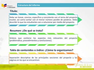 Este documento describe la estructura básica que debe seguir un informe de proyecto escolar, incluyendo una sección para el título, resumen, tabla de contenido, planteamiento de la problemática, objetivos, justificación, marco teórico, metodología, análisis de la solución, conclusiones y recomendaciones, bibliografía y anexos. La metodología debe incluir un hexágono interdisciplinario y un cronograma de actividades. El informe busca comunicar de manera ordenada cómo los estudiantes identificaron y