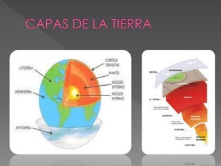 Este documento describe la estructura interna de la Tierra y los procesos geológicos que ocurren en ella. Explica que la Tierra está compuesta de la corteza, el manto y el núcleo, y que el calor interno se transmite por conducción y convección, lo que causa movimientos de placas tectónicas y plumas mantélicas. También cubre métodos para estudiar la estructura interna de la Tierra como la gravimetría.