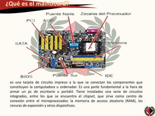La placa base es una tarjeta de circuito impreso fundamental para armar una computadora, ya que conecta los principales componentes como el microprocesador, la memoria RAM, las ranuras de expansión y otros dispositivos a través de circuitos integrados como el chipset.