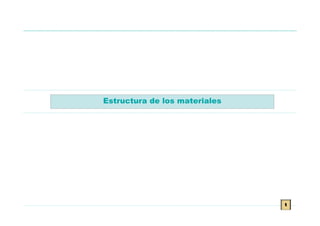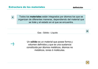 El documento describe la estructura de los materiales. Explica que los sólidos pueden ser amorfos u cristalinos dependiendo del arreglo de sus partículas. Los cristalinos tienen una estructura periódica ordenada definida por celdas unitarias, mientras que los amorfos no presentan un orden a larga distancia. También describe defectos comunes en las microestructuras de los materiales como vacancias, átomos intersticiales y dislocaciones.