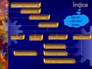 Este documento describe los principales componentes de un motor de arranque, incluyendo el rotor, el estator, los soportes, las escobillas, el relé de arranque, el piñón de engrane y otros. Explica los sistemas de rueda libre y los motores con reductora, describiendo la corona y los portasatélites. También cubre los motores con piñón libre y engrane de inercia.