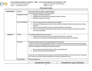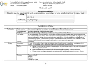 Este plan de acción tutorial propone el uso de herramientas TIC para facilitar la construcción del conocimiento en el área de humanidades mediante un enfoque de aprendizaje significativo. El plan dura 16 semanas e implementa estrategias centradas en el estudiante, como la creación de grupos de trabajo y actividades colaborativas evaluadas mediante rubricas. El acompañamiento al estudiante se realiza de forma directa a través de conferencias en Skype y correo electrónico, e indirectamente utilizando recursos como Google Drive y Edmodo.