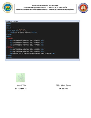 El documento presenta un informe sobre un proyecto de una página web realizado por un estudiante de la Universidad Central del Ecuador. El proyecto tuvo como objetivo reconocer la estructura básica de una página web en HTML e incluyó actividades como identificar las partes principales de una página y usar correctamente etiquetas. El estudiante creó un encabezado con diferentes títulos para mostrar su comprensión de la estructura de una página web.