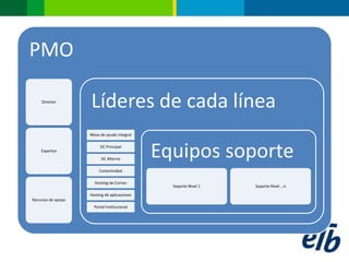 La PMO será responsable de coordinar las líneas del proyecto para estandarizar y optimizar el proceso y resultados. Primero, establecerá la metodología de gestión de proyectos basada en estándares como PMI e ITIL. Segundo, diseñará la implementación a través de un Plan de Gestión del Proyecto que cubra alcance, tiempo, costos, calidad, comunicaciones, riesgos, recursos humanos y adquisiciones.