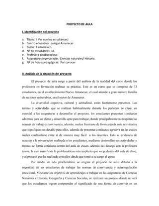 Este proyecto de aula busca mejorar la convivencia y el aprendizaje de los estudiantes de 2o básico en un colegio vulnerable. Se implementarán normas de convivencia y estaciones representando cada temporada del año para enseñar sobre el clima. Los estudiantes trabajarán en grupo para crear historias e investigar sobre las estaciones. El objetivo es que desarrollen habilidades sociales y conozcan los cambios estacionales a través de actividades prácticas y colaborativas.