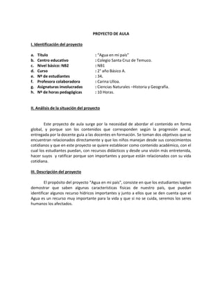 Este documento presenta un proyecto de aula titulado "Agua en mi país" dirigido a estudiantes de 2° año básico. El proyecto busca que los estudiantes aprendan sobre el ciclo del agua, la importancia de este recurso, y características de los paisajes de Chile. Se describen los objetivos del proyecto, contenidos, actividades y forma de evaluación. El proyecto se basa en una metodología de aprendizaje por proyectos y busca desarrollar habilidades en los estudiantes a trav