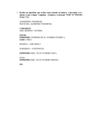 El documento presenta dos algoritmos. El primero determina si un número es par o impar mediante el cálculo del residuo de la división entre el número y 2. El segundo calcula el aumento de sueldo de acuerdo al tiempo de servicio en una institución, aplicando incrementos de 3%, 5%, 8% o 12% según si el tiempo es de 1-5 años, 5-10 años, 10-20 años o más de 20 años respectivamente.