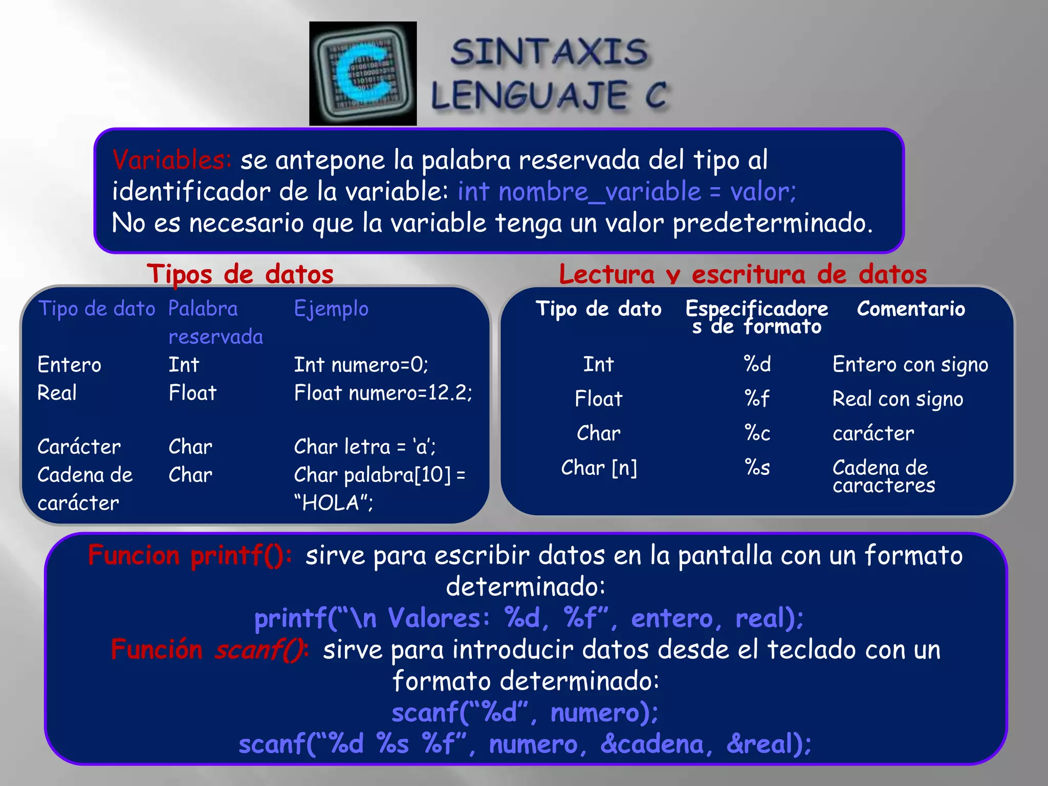 Funcion printf(): sirve para escribir datos en la pantalla con un formato