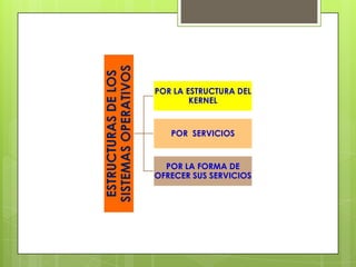 El documento describe las diferentes estructuras de los sistemas operativos, incluyendo si son monolíticos o por capas, si son monousuarios, multiusuarios, monotarea o multiproceso. También describe si los sistemas operativos ofrecen servicios de forma local, de red o distribuida entre máquinas. Finalmente, menciona algunos ejemplos de sistemas operativos distribuidos como Sprite, Solaris-MC, Mach y Chorus.