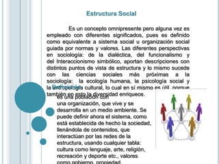 El documento aborda el concepto de estructura social, definiéndola como una población organizada que interactúa en un ambiente determinado, e incluye diferentes enfoques sociológicos. También describe los grupos que componen la estructura social, destacando la distinción entre grupos primarios y secundarios, así como las normas que rigen la convivencia en la sociedad. La teoría social se presenta como el estudio del desarrollo y función de diversas colectividades e instituciones dentro de la sociedad humana.