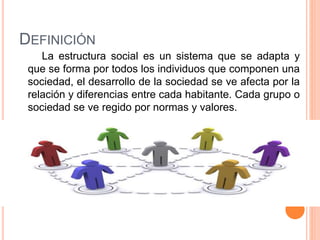 Este documento resume las clases sociales en el mundo contemporáneo. Define la estructura social como un sistema formado por las relaciones entre individuos de una sociedad. Explica que las clases sociales surgieron debido a factores como la cultura, política y economía, y que actualmente se dividen en clases alta, media y baja. También describe los grupos sociales primarios y de asociación, y las normas convencionales, morales y jurídicas que rigen la estructura social.