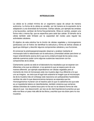 Este documento presenta los resultados de una práctica de laboratorio sobre tejidos animales. Los estudiantes observaron células de cebolla, papa, elodea y microorganismos utilizando un microscopio óptico y diversos reactivos como lugol. Identificaron estructuras celulares como núcleos, vacuolas, cloroplastos y cambios en las muestras luego de la aplicación de lugol. Concluyeron que la práctica les permitió comprender mejor la estructura celular y la importancia del avance c