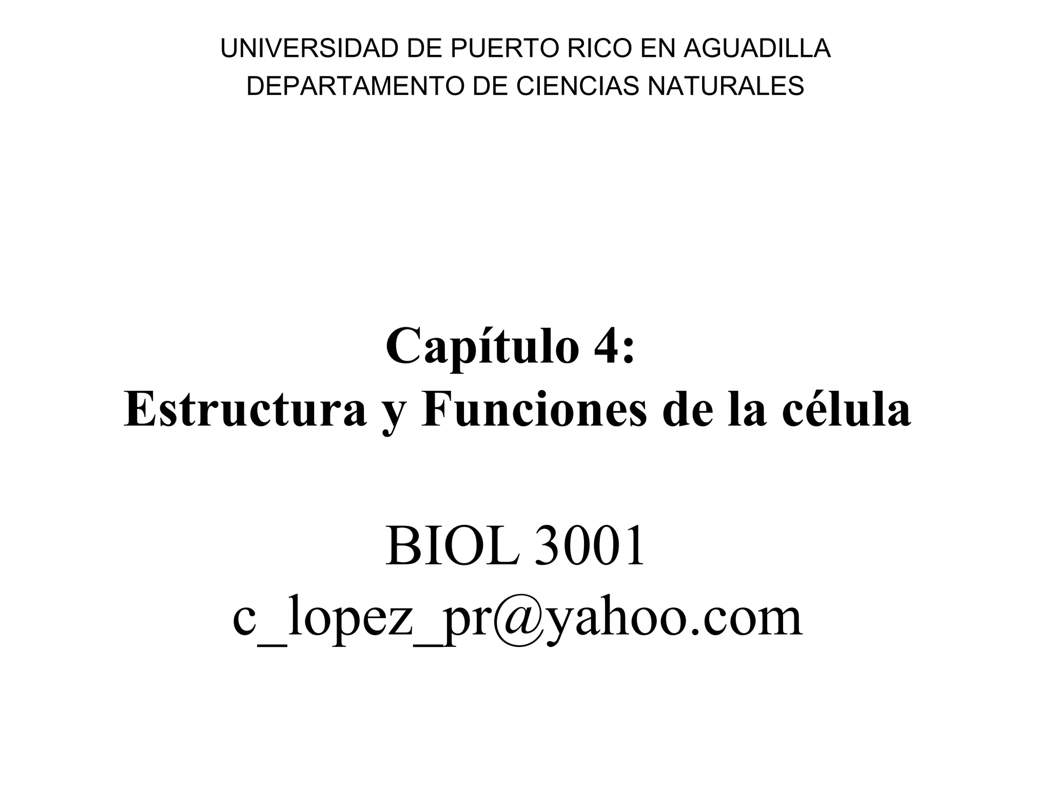Este documento presenta los objetivos y conceptos clave sobre la estructura y función de la célula. Los objetivos incluyen entender la teoría celular, comparar células procariotas y eucariotas, explicar la relación entre área de superficie y volumen celular, y describir los orgánulos y su función. También describe los tipos de microscopios usados para estudiar las células, como el microscopio de luz y electrónico, y conceptos como magnificación y resolución. Finalmente, resume las características generales de