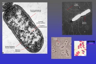 Este documento describe las partes principales de una bacteria, incluyendo la pared de peptidoglicano, la membrana, el genóforo, el flagelo, el cuerpo basal del flagelo, los gránulos citoplasmáticos, el cuerpo de inclusión, el plasmide, las fimbrias y los polirribosomas. También menciona la cápsula y la endospora como características opcionales que algunas bacterias pueden tener.