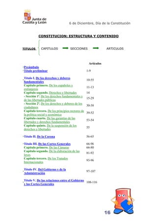 La Constitución española se estructura en 10 títulos y un título preliminar, que contienen un total de 169 artículos más un preámbulo. Los títulos se dividen en capítulos, y a veces los capítulos en secciones, para clasificar los diferentes temas constitucionales. La Constitución también incluye disposiciones adicionales, transitorias y derogatoria al final. Se divide entre una parte dogmática sobre principios y derechos, y una parte orgánica sobre los órganos del Estado.