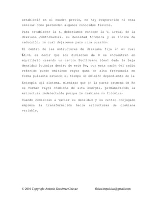 Este documento describe las estructuras de drakiana fija, como agujeros negros, que no alcanzaron el radio necesario para evolucionar a sistemas variables. Estas estructuras son sistemas resonantes simples con una temperatura crítica cercana al cero absoluto. En el centro de estas estructuras, los divisores de cero se encuentran en equilibrio creando un centro euclidiano ideal, permitiendo la emisión de rayos gamma de alta frecuencia.