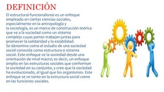 El estructural-funcionalismo es un enfoque en ciencias sociales que analiza la sociedad como un sistema complejo donde sus partes colaboran para la estabilidad y la solidaridad. Desarrollado por Émile Durkheim y Bronislaw Malinowski, este paradigma se centra en las funciones de las estructuras sociales más que en su origen histórico. Además, el estructuralismo se basa en la lingüística de Ferdinand de Saussure, buscando las reglas subyacentes que generan significados en la cultura.