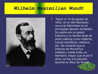 Wilhelm Wundt nació en 1832 en Alemania. Tuvo una infancia solitaria y su educación estuvo influenciada por su abuelo, quien lo llevaba de viaje y exigía rigurosidad. Estudió en varias escuelas secundarias antes de ingresar a la universidad para estudiar medicina. Posteriormente se graduó de química en la Universidad de Heidelberg en 1855. En 1879 fundó el primer laboratorio de psicología experimental en la Universidad de Leipzig y defendió la independencia de esta nueva ciencia llamada ps