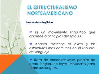 El documento describe el estructuralismo lingüístico, un movimiento del siglo XX que analiza y describe las estructuras y el léxico más comunes en el uso oral del lenguaje. Busca encontrar leyes propias de cada lengua y estudia la lengua en su estado actual utilizando un método inductivo. También presenta los principales representantes del estructuralismo lingüístico norteamericano como Sapir, Bloomfield y Whorf.