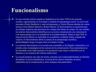 El documento presenta información sobre diferentes corrientes teóricas en comunicación y sociología como el funcionalismo, estructuralismo, teoría crítica y la escuela de Frankfurt. También introduce brevemente a pensadores clave como Durkheim, Parsons, Levi-Strauss, Adorno y Habermas y sus contribuciones al estudio de estas áreas.