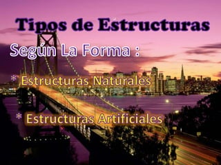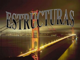 Este documento describe tres tipos principales de estructuras: estructuras masivas, estructuras laminares o de carcasa, y estructuras esqueléticas. Las estructuras masivas son muy pesadas y usan grandes cantidades de material. Las estructuras laminares están compuestas de láminas resistentes que envuelven y protegen un objeto. Las estructuras esqueléticas están formadas por piezas alargadas como barras y vigas unidas para formar un armazón.