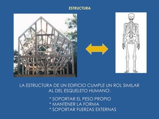 Este documento describe las nociones básicas sobre la estructura de un edificio. Explica que la estructura soporta el peso propio del edificio y las fuerzas externas, y transmite las cargas al terreno a través de cimientos. Describe los diferentes tipos de cimientos como lineales, puntuales y superficiales, y los materiales comunes para estructuras como hormigón armado, madera y mampostería. También cubre conceptos como losas, vigas, columnas y zapatas.