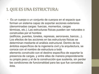 El documento describe los principales tipos de estructuras y sus componentes. Explica que una estructura es un sistema capaz de soportar cargas externas y puede ser natural o construida por el hombre. Luego describe los diferentes tipos de estructuras según su origen, movilidad, función y materiales. Finalmente, detalla elementos comunes como pilares, vigas, columnas, bisagras y perfiles utilizados en la construcción de estructuras.