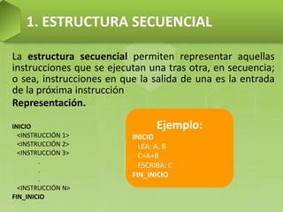 El documento describe las tres estructuras algorítmicas básicas: 1) estructura secuencial, que ejecuta instrucciones una tras otra; 2) estructura de decisión lógica, que ejecuta una de dos secuencias posibles dependiendo del resultado de una condición; y 3) estructura repetitiva, que ejecuta una secuencia múltiples veces dependiendo del resultado de una condición. También describe variables como contadores y acumuladores que son útiles para estructuras repetitivas.