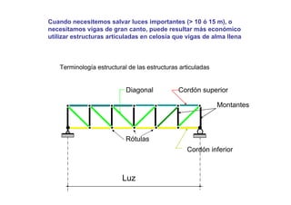 Las estructuras articuladas son útiles para salvar grandes luces y cuando se requieren vigas de gran canto de forma económica. Están formadas por barras unidas por rótulas que permiten movimiento en una dirección. Se pueden analizar estáticamente mediante el equilibrio de nudos o métodos gráficos como Cremona.