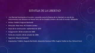 Este documento presenta información sobre varias estructuras artificiales notables alrededor del mundo. Describe brevemente la Estatua de la Libertad, el Big Ben, la Torre Eiffel, la India Catalina, la estatua de Simón Bolívar, el Cristo Redentor, puentes colgantes, montañas rusas, el Coliseo Romano y las pirámides egipcias, incluyendo detalles como su ubicación, fecha de construcción y arquitectos. Cada sección incluye también un gráfico ilustrativo de la estructura