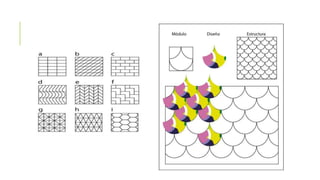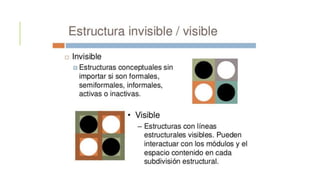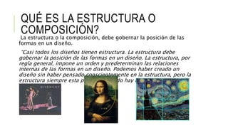 Este documento describe las estructuras composicionales en diseño gráfico. Explica que la estructura gobierna la posición de los elementos en un diseño y siempre está presente cuando hay organización. Luego describe tres tipos principales de estructuras - formal, semiformal e informal - y sus características. Finalmente, distingue entre estructuras visibles e invisibles, y entre estructuras activas e inactivas.