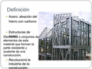 Este documento describe las estructuras de acero, incluyendo su definición como aleaciones de hierro y carbono que forman la parte resistente de una construcción. Explica las ventajas de las estructuras de acero como su durabilidad, seguridad y montajes rápidos, pero también sus desventajas como la corrosión y necesidad de mantenimiento. Finalmente, detalla los procesos de diseño, elaboración, conexión y montaje de las estructuras de acero.