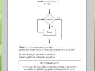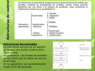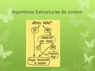 El documento describe diferentes estructuras de control para algoritmos, incluyendo estructuras secuenciales, selectivas (condicionales) y repetitivas. También define conceptos como contador, acumulador y presenta dos ejercicios de programación para ilustrar el uso de estas estructuras de control.