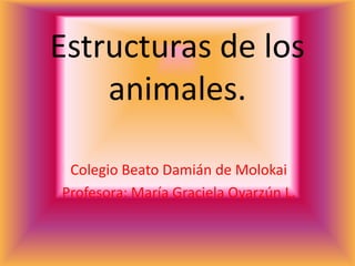 Este documento describe las diferentes estructuras que usan los animales para moverse, incluyendo patas, aletas y alas. Explica que las patas sostienen el cuerpo en la tierra, las aletas se usan para nadar en el agua, y las alas solo las tienen aves, murciélagos e insectos para volar. También menciona algunos animales que tienen membranas pero no pueden volar.