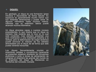 3) Los documentos describen diferentes tipos de diques basados en su composición, textura y distribución, incluyendo diques diabás