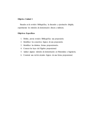 Este documento presenta los objetivos y contenidos de la Unidad 1 de la asignatura Estructuras Discretas I. Introduce conceptos clave como proposición, conectivos lógicos, formas proposicionales y lógica proposicional. Explica que las formas proposicionales son funciones de verdad que dependen de si sus proposiciones componentes son verdaderas o falsas y de los significados de los conectivos lógicos que las unen. También menciona las leyes del álgebra proposicional y que estas pued
