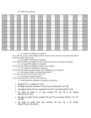 El documento presenta un análisis de un grafo no dirigido y de un dígrafo. En el grafo no dirigido se analizan propiedades como conectividad, regularidad y se presentan cadenas y ciclos. En el dígrafo se encuentran la matriz de conexión, cadenas y ciclos, y se demuestra que es fuertemente conexo aplicando la matriz de accesibilidad.