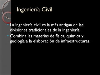 La ingeniería civil es la rama más antigua de la ingeniería y se encarga del diseño, construcción y mantenimiento de la infraestructura de un país. La ingeniería estructural es un área de la ingeniería civil que se ocupa del análisis y diseño de estructuras para que resistan de forma segura las fuerzas que actúan sobre ellas mediante la selección adecuada de materiales de construcción. Los ingenieros estructurales se aseguran de que sus diseños cumplan con los estándares de seguridad y servicio de