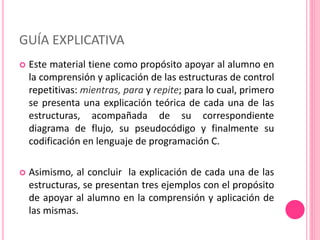 Este documento presenta las estructuras de control iterativas (bucles) mientras, para y repite. Explica sus conceptos, diagramas de flujo, pseudocódigo y código en C. Incluye ejemplos resueltos y propuestos para cada estructura. El objetivo es que los estudiantes identifiquen y utilicen estas técnicas para resolver problemas implementándolos en la computadora mediante pseudocódigo y programación en C.