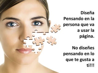 Este documento ofrece consejos sobre el diseño web enfocado en el usuario, como diseñar pensando en la persona que usará la página en lugar de en los propios gustos del diseñador. También incluye ejemplos de código HTML para crear tablas y celdas, y recomendaciones sobre el uso de fondos de textura, colores enteros, y alineación a la izquierda para pantallas grandes. Por último, proporciona enlaces a páginas web de ejemplo.