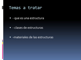 Este documento describe las estructuras y los materiales utilizados en ellas. Explica que una estructura es el conjunto de elementos que soportan y dan forma a un edificio u objeto. Luego detalla los diferentes tipos de estructuras como masivas, abovedadas, entramadas y trianguladas. Finalmente, enumera los materiales comúnmente usados en las estructuras como cemento, hormigón, acero, madera y vidrio.