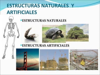 Este documento habla sobre las estructuras naturales y artificiales, sus funciones y tipos. Explica que las estructuras artificiales están diseñadas para soportar peso, salvar distancias o proteger objetos. Describe los tipos de estructuras resistentes como laminar, de armazón, de hormigón armado y de vigas metálicas. También explica los tipos de fuerzas y esfuerzos que actúan en las estructuras y cómo se pueden hacer estructuras estables, resistentes y rígidas.