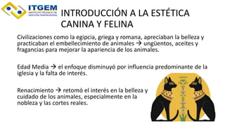 1) La estética canina y felina ha evolucionado a través de la historia, desde las civilizaciones antiguas hasta convertirse en una industria moderna. 2) Actualmente, los servicios estéticos para mascotas incluyen baños, cortes de pelo, cuidado de la piel y uñas, y ayudan a mejorar la higiene, salud y bienestar de los animales. 3) Es importante que los profesionales de la estética conozcan la anatomía, tipos de pelaje y problemas comunes de piel y pelo de diferentes razas