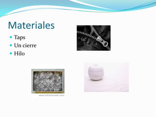 Sebastián González creó un estuche utilizando taps, hilo y un cierre. Unió los taps con hilo, les dio forma de estuche y finalmente cosió un cierre a la superficie.