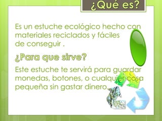 Este documento describe cómo hacer un estuche ecológico y barato utilizando materiales reciclados como botellas plásticas. El estuche se puede usar para guardar monedas u otros objetos pequeños, y ayuda a reciclar y proteger el medio ambiente. El proceso implica cortar botellas plásticas, coser una cremallera, y decorarlo.