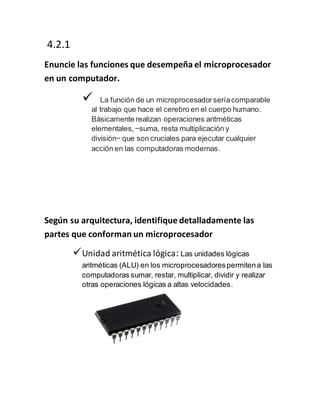 El documento describe las funciones y partes principales de un microprocesador. Explica que las funciones principales son realizar operaciones aritméticas básicas como suma, resta, multiplicación y división. Luego detalla las partes clave como la unidad aritmética lógica, la memoria caché, los transistores, las señales de control, el coprocesador matemático, la unidad de control, el decodificador de instrucciones y otros componentes. También cubre temas como los tipos de conexión, métodos de refrigeración,
