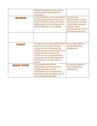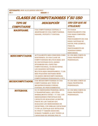 Este documento describe diferentes tipos de computadoras y sus usos principales. Describe los mainframes como computadoras grandes y potentes usadas por grandes compañías, los minicomputadores y microcomputadoras usados para propósitos personales, notebooks, netbooks y tablets usados de forma móvil principalmente para propósitos personales, y los smartphones usados también para propósitos personales.