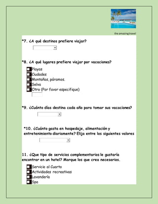 El documento contiene una encuesta sobre preferencias de viaje. Realiza más de 40 preguntas sobre detalles demográficos, destinos favoritos, presupuesto de viaje, compañía preferida, tipo de alojamiento y actividades durante los viajes. Busca obtener información detallada sobre los gustos y hábitos de los viajeros para ofrecer recomendaciones personalizadas.