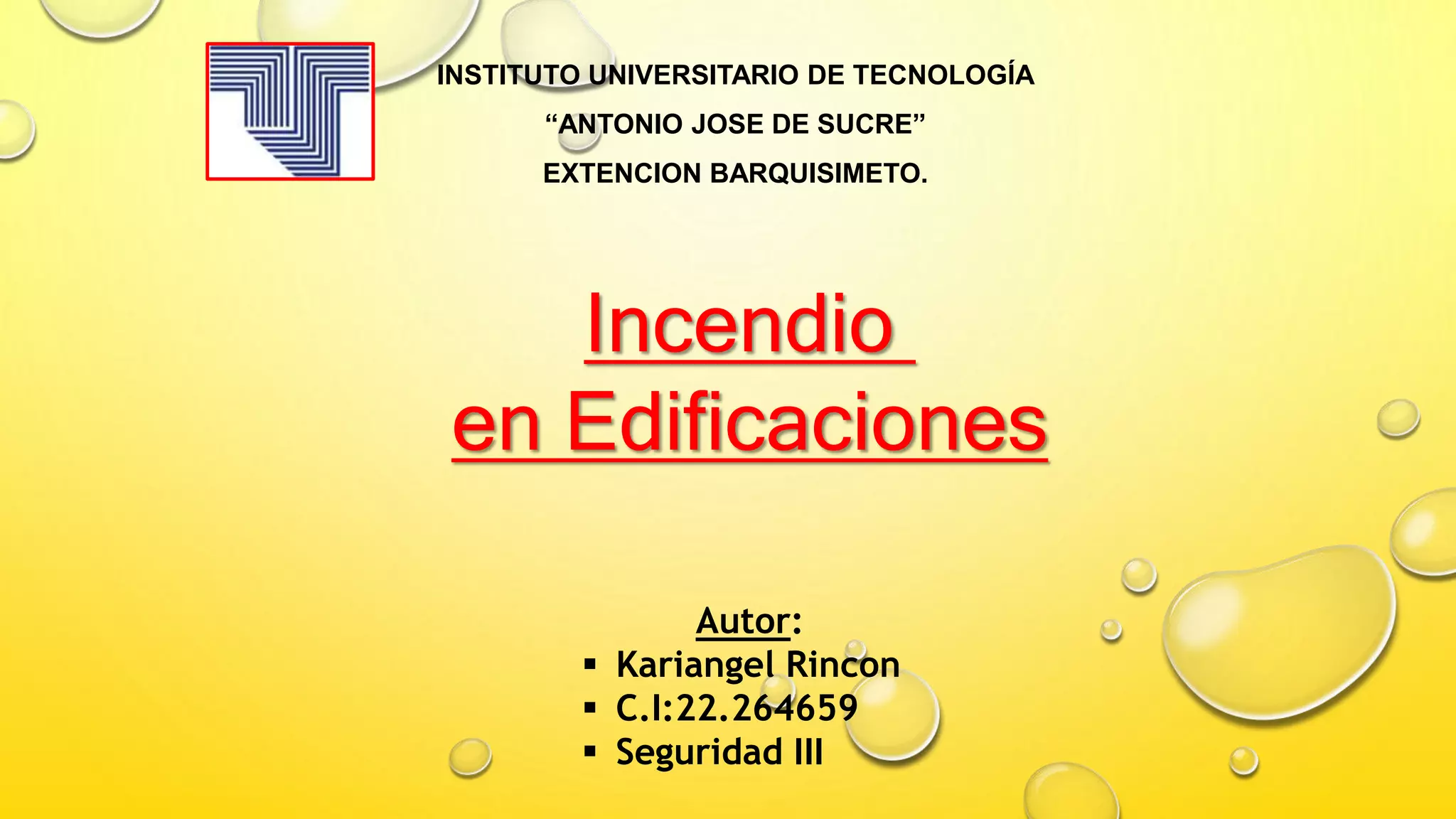 El documento proporciona información sobre incendios en edificaciones. Define un incendio, explica los mecanismos para extinguirlos y las causas más comunes como cortocircuitos, cigarrillos, cortes y soldaduras, llamas abiertas, fricción y superficies calientes. También cubre diseños seguros de edificaciones con salidas de emergencia amplias, señalizaciones, detectores de humo y extintores apropiados. Por último, menciona cuatro tipos de explosiones: físicas, químicas,