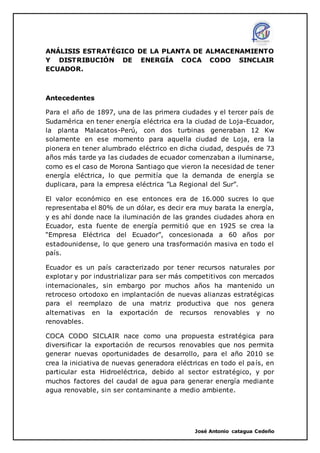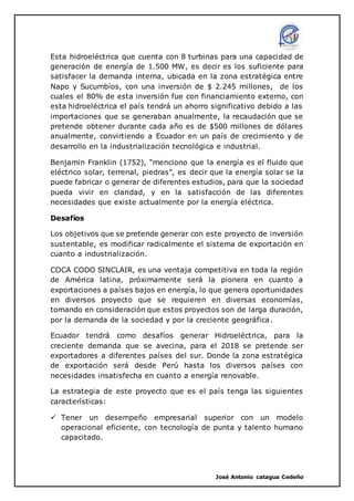 Este documento describe el proyecto de la planta hidroeléctrica Coca Codo Sinclair en Ecuador. La planta generará 1,500 MW de energía renovable a un costo de $2,245 millones. Se espera que la planta ahorre $2,600 millones en importaciones de energía en los próximos 5 años y genere $500 millones en ingresos anuales. La planta permitirá que Ecuador se convierta en exportador de energía renovable a países vecinos y promoverá el desarrollo industrial y tecnológico del país.